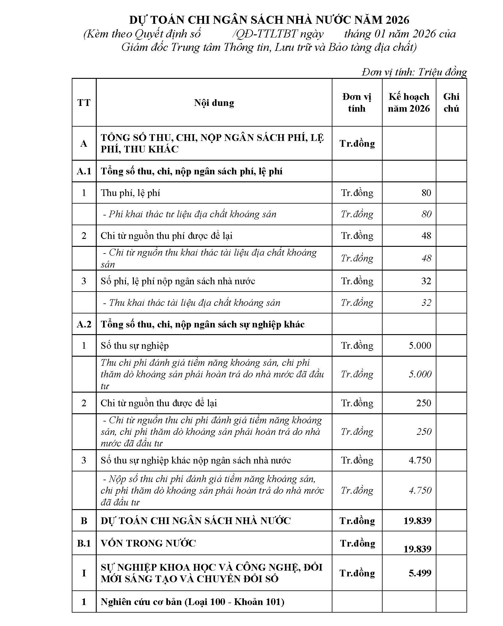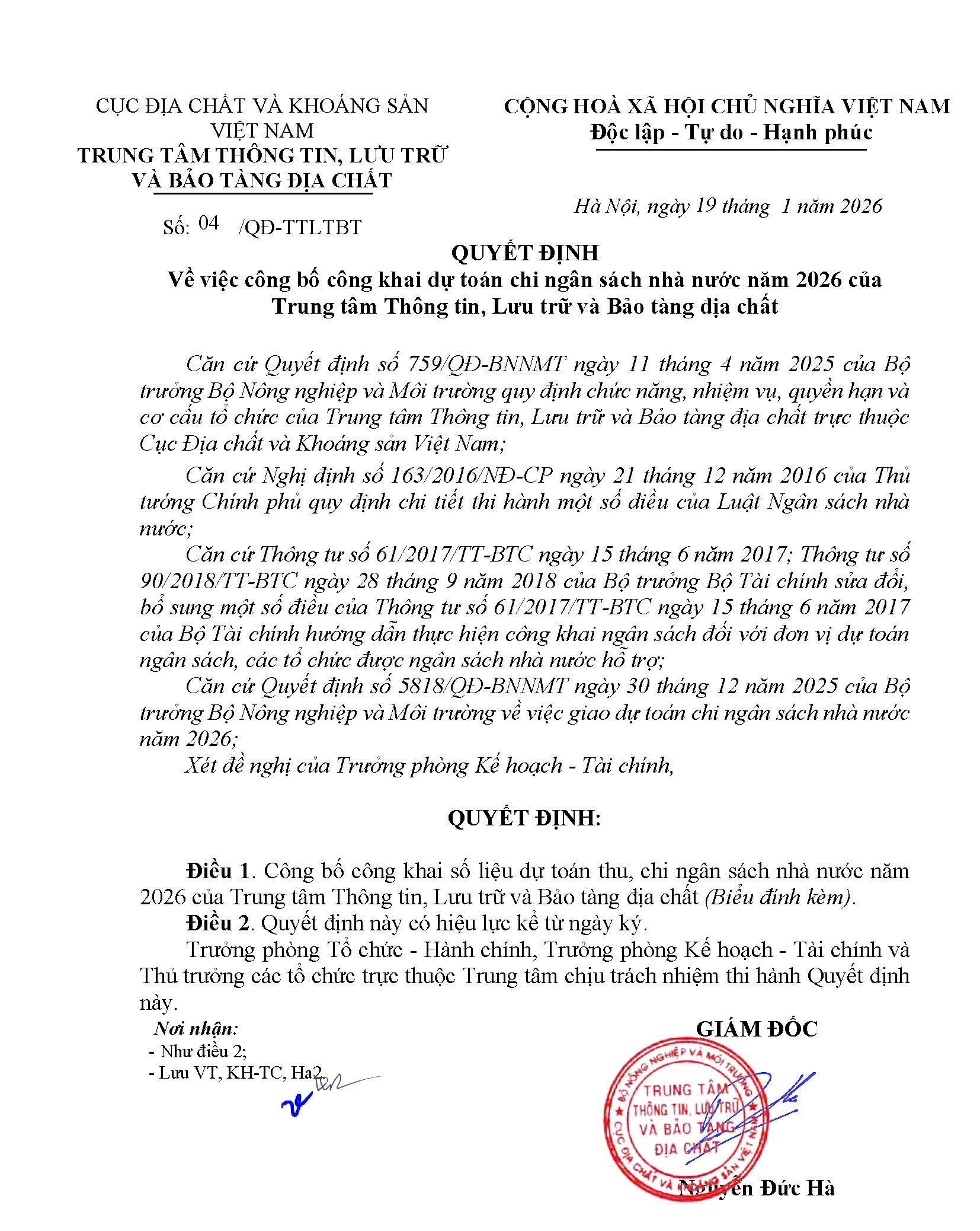 Quyết định về việc công bố công khai dự toán chi ngân sách Nhà nước năm 2026 của Trung tâm Thông tin, Lưu trữ và Bảo tàng địa chất