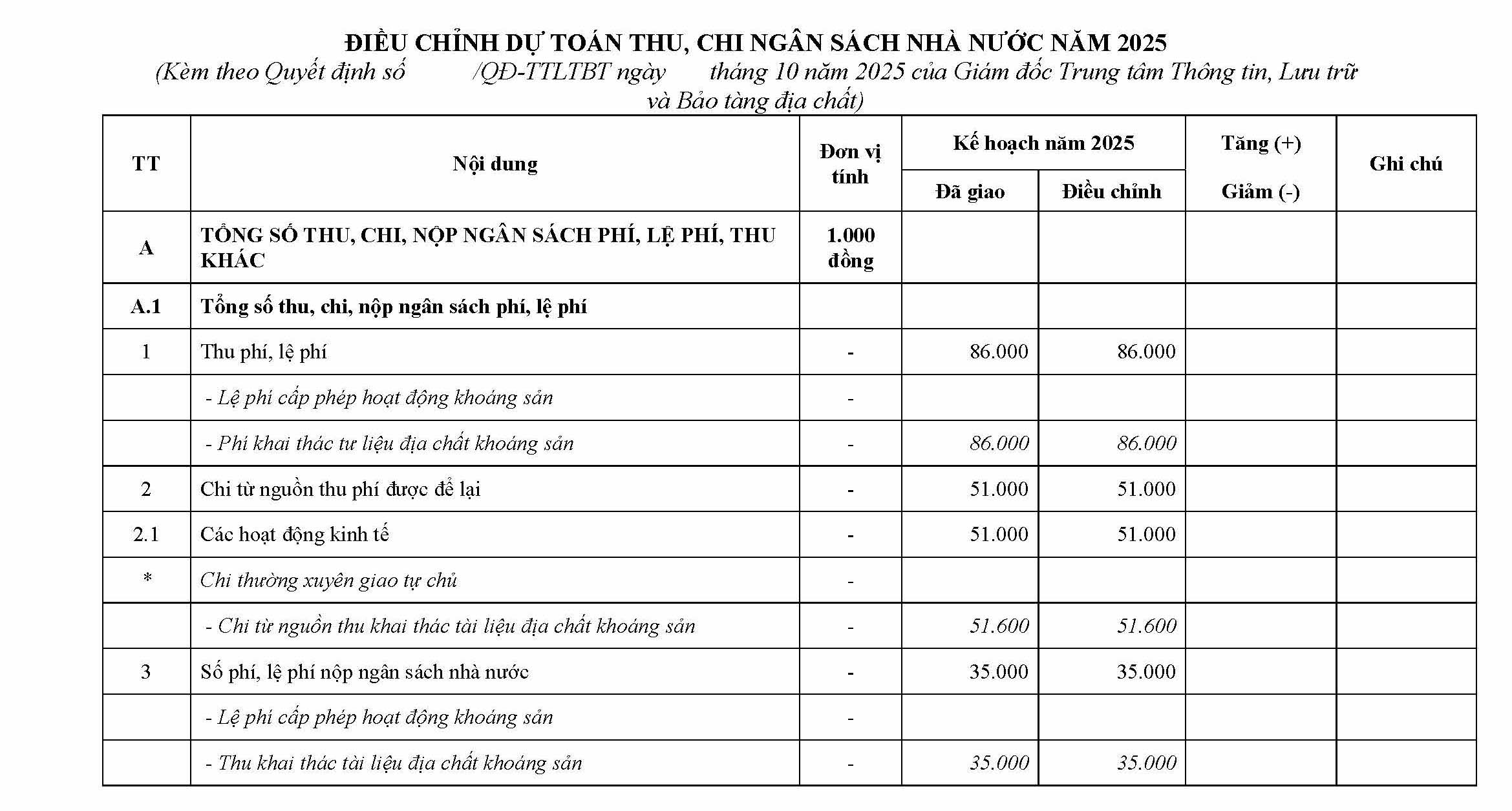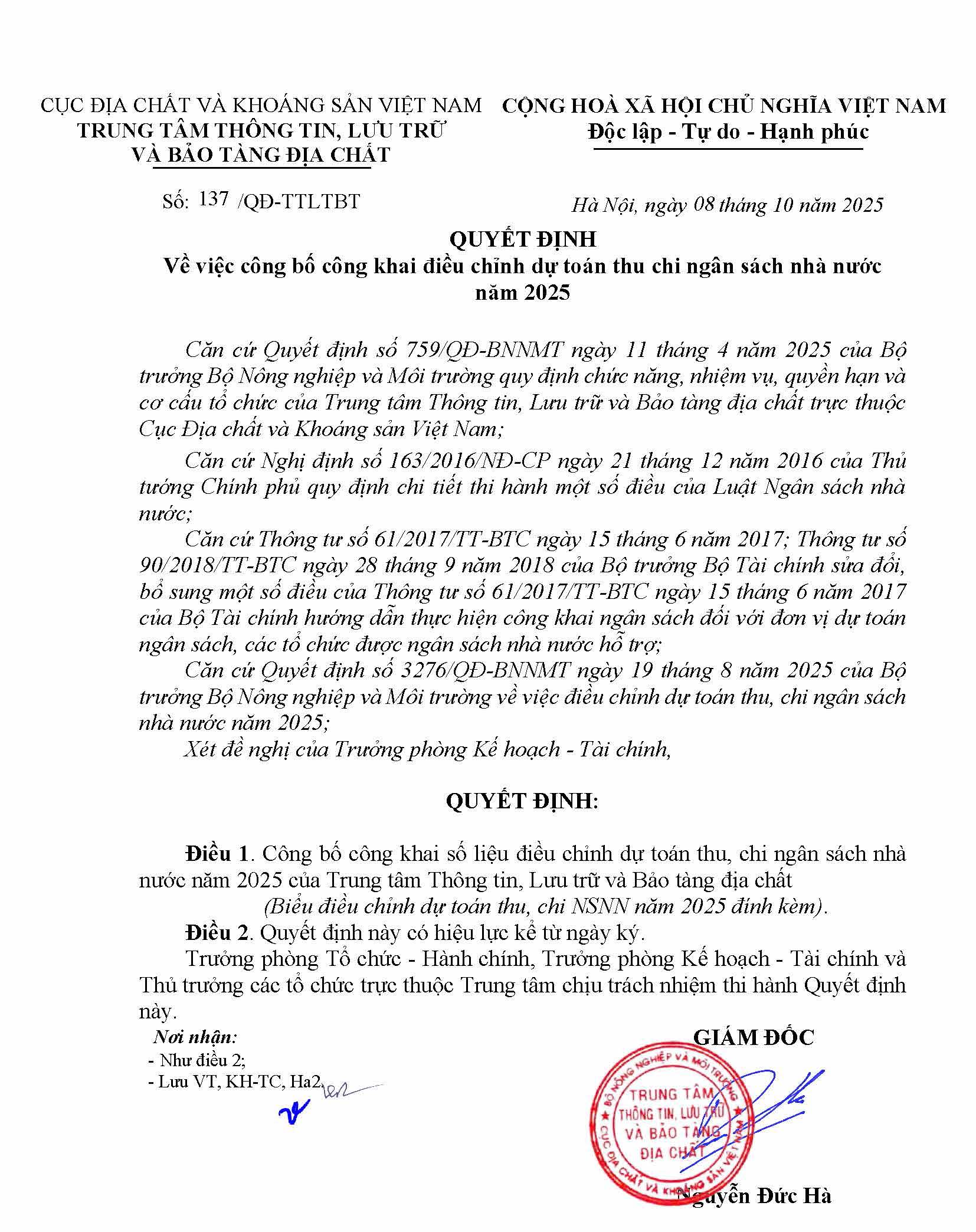 Quyết định về việc công bố công khai điều chỉnh dự toán thu, chi ngân sách nhà nước năm 2024 của Trung tâm Thông tin, Lưu trữ và Bảo tàng địa chất