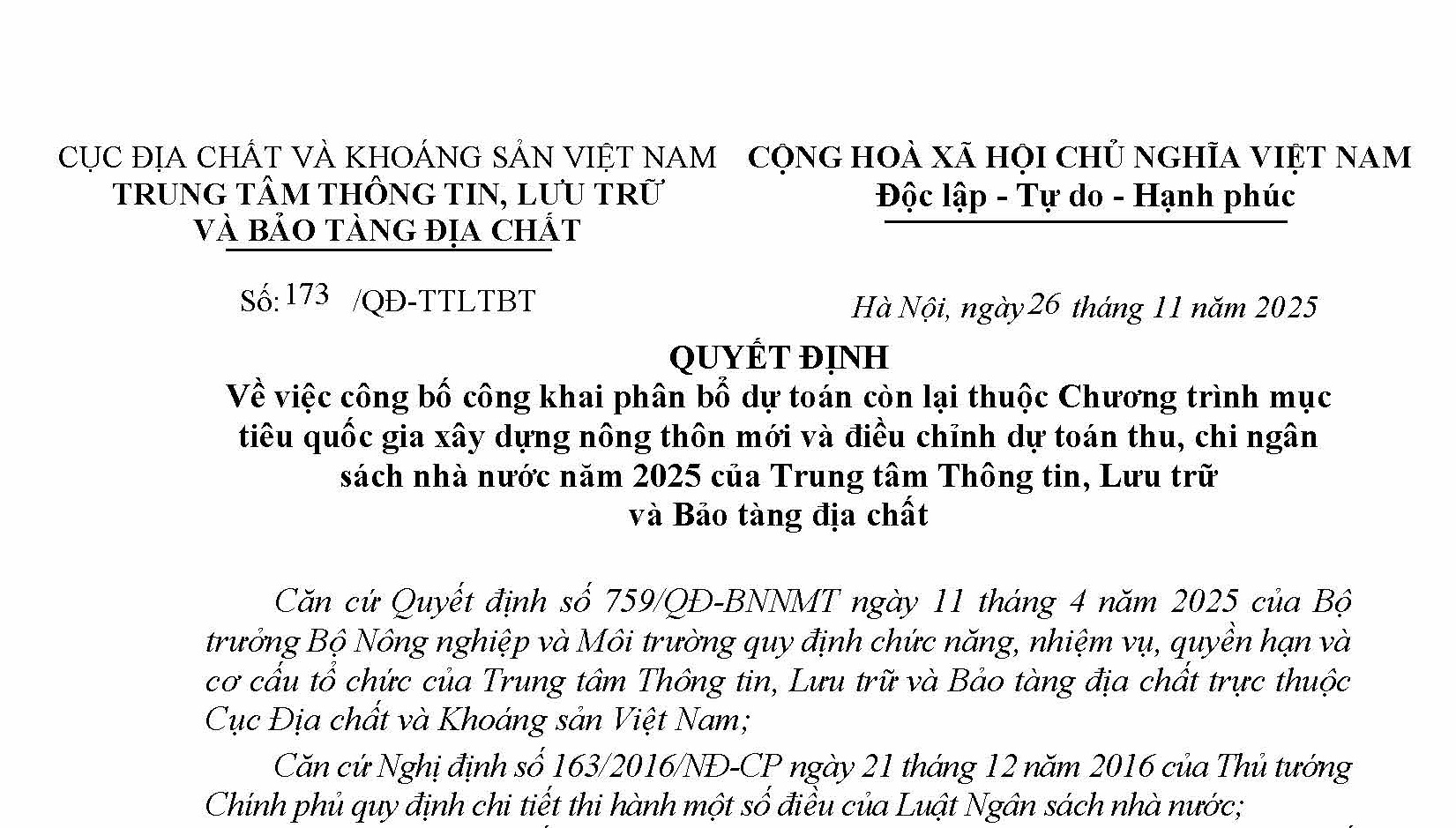 Quyết định số 173/QĐ-TTLTBT ngày 26 tháng 11 năm 2025 của Trung tâm Thông tin, Lưu trữ và Bảo tàng địa chất về việc công bố công khai phân bổ dự toán còn lại thuộc Chương trình mục tiêu quốc gia xây