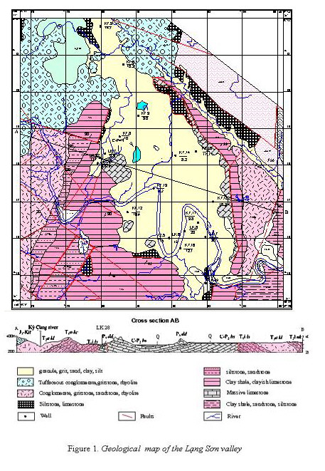 On the surface of the Lạng Sơn Depression, there are Quaternary sediments, consisting mainly of clay, silty clay, silt mixed with sand and grit-gravel with a thickness not surpassing 20 m, having the sinking coefficient varying from 1.58 to 3.13 kg/cm², among them the largest distributive area belongs to Lower-Middle Holocene clay and loam having the sinking coefficient varying from 1.98 to 2.53 kg/cm². Construction works having the loading capacity surpassing this value make easy to occur the collapse of subterranean karstic caves, especially when the extraction of groundwater reaches the large scale. This is also the area where limestone is exposed directly on the surface of relief in the form of relic peaks or forms steep cliffs in the two banks of the Kỳ Cùng River (in the section where there is army quarter, and the section extending from Tiên Pagoda to Mai Pha Bridge). Karstic caves surely have streams which converge in the Kỳ Cùng River that is observed in area of the Tam Thanh and Nhị Thanh caves, where emitted water flows into the stream running near the Lạng Sơn Polyclinic, then discharges into the Kỳ Cùng River. The areas, where the cave system is strongly developed, are much vulnerable, and latent in such phenomena as collapse of subterranean karst (as in Hà Tây, Phú Thọ, Quảng Trị, etc...). Through our investigation we think that, it is necessary to study in details the rule of karstic distribution during the planning process of construction, because it is a factor causing the loss of stability of the geological environment. Apart from this, the enlargement of groundwater extraction in this area needs a detailed study on the appearance of the above said collapse and a calculation of most rational extracted water quantity, otherwise, there will be great consequences for construction works.