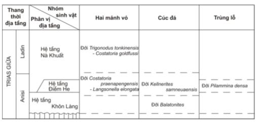 trung ở Đông Bắc Bộ chứa các đới hóa thạch Hai mảnh vỏ, Cúc đá và Trùng lỗ. Các đới Hai mảnh vỏ gồm Costatoria
